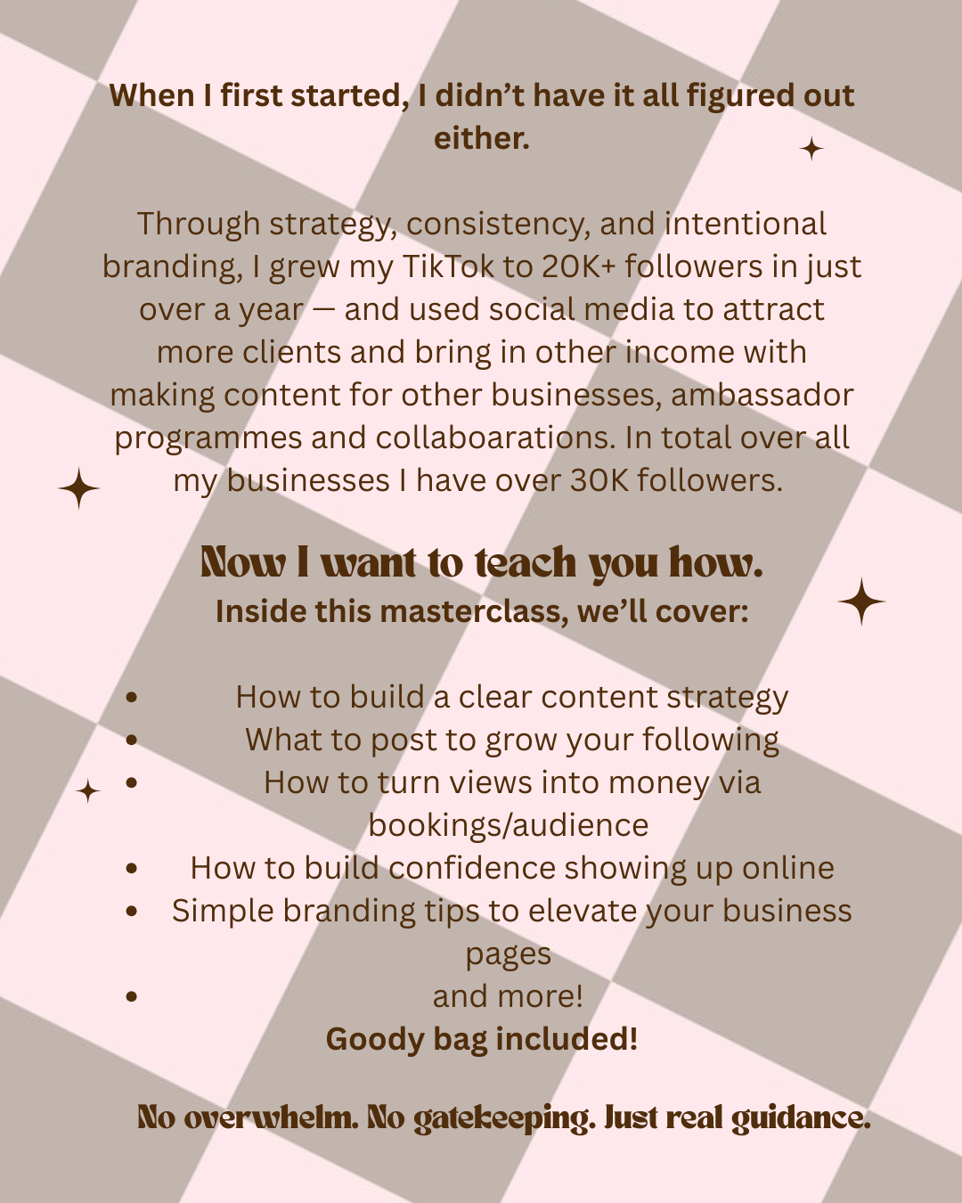 In just over a year, I grew my TikTok to 20,000+ followers using strategy, consistency, and intentional branding — not luck. In total on all my socials I have over 30,000. Now I’m breaking down exactly how I did it and how you can apply the same principles to grow your page and attract more clients and a paying audience.